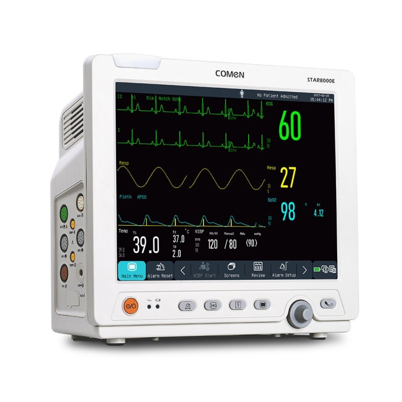 O Star8000F é um monitor versátil que atende a um grande espectro de departamentos hospitalares, como triagem, UTI, Centro Cirúrgico, etc para pacientes adultos, pediátricos e neonatais. O Monitor multiparamétrico Star8000 básico vem com 6 parâmetros pré-configurados: ECG, SpO2, Frequência Respiratória, Pressão Não Invasiva, Temperatura e capnografia*. Opcionais de Pressão Invasiva, Tela Touch Screen e impressora térmica incorporada. Tela de 12 polegadas. Possui bateria de lítio para autonomia mínima de 2 horas. Completo sistema de alarmes e registro completo de dados de paciente. ECG com analise de segmento ST e arritmias, para 3 ou 7 derivações simultâneas. A capnografia pode ser configurada para usar sensores das marcas Respironics ou Masimo.